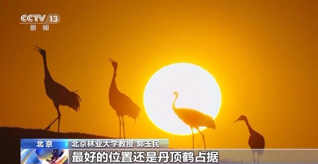 北京林业大学教授 郭玉民:白枕鹤跟丹顶鹤有的时候同域分布,最好的位置还是丹顶鹤占据,白枕鹤在边缘。白头鹤挤得没地方,就上森林湿地了。
