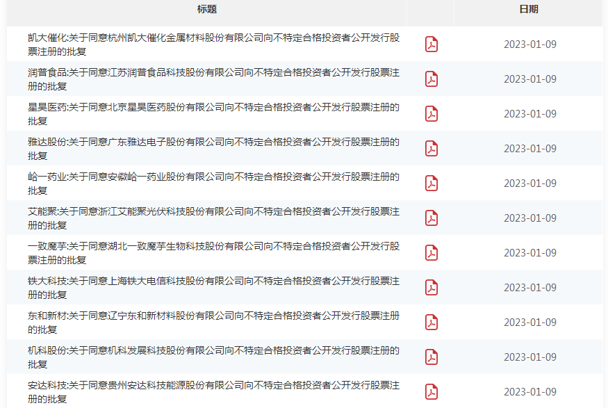 1月9日,北交所官网披露,机科股份、星昊医药、凯大催化、润普食品、峆一药业、雅达股份、艾能聚、一致魔芋、铁大科技、东和新材、安达科技共计11家企业获得注册批复。