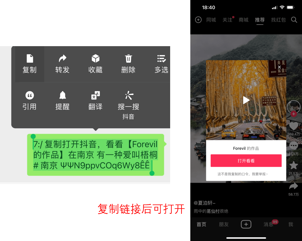 记者11日测试,分享至微信的抖音口令链接可正常跳转 图片来源:APP截图
