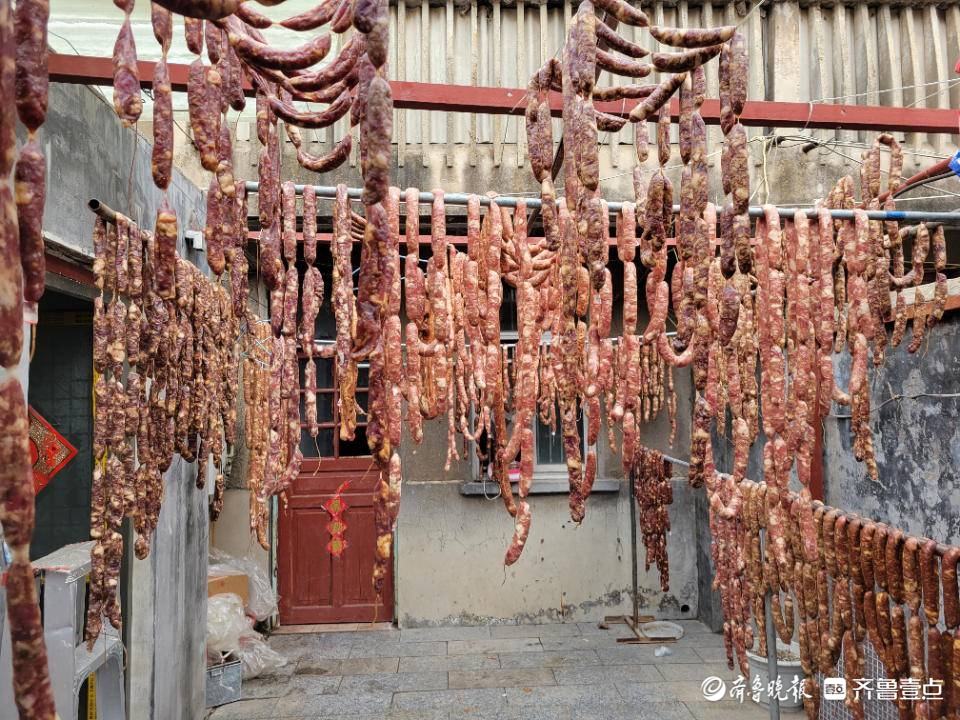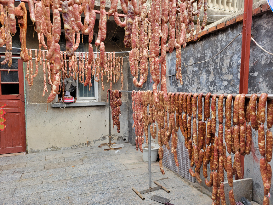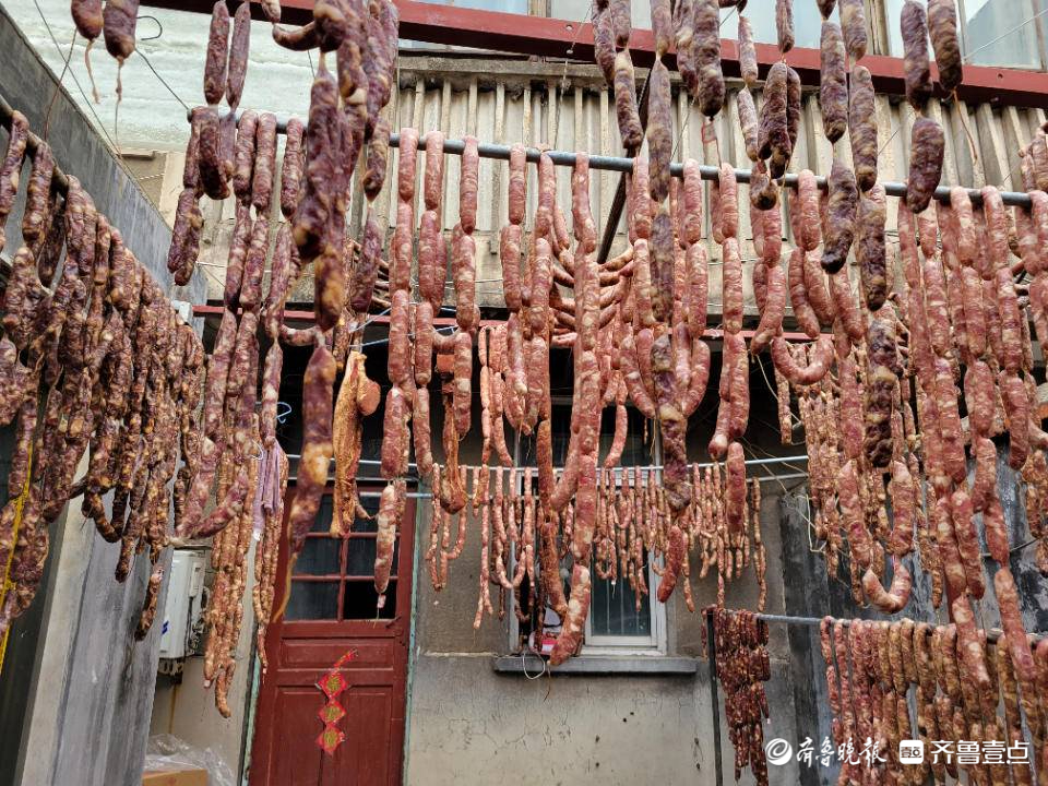 走进李阳家的后院,一架架“肉肠帘”摆放在院子里,肥瘦相间的肉馅被半透明的肠衣包裹着,散发着浓郁的香气。“这都是顾客定好的香肠,这架子上晾的差不多了,一会给顾客打电话让他下午过来拿,那边架子的还不行,是前两天刚灌的,还得再等两天......”李阳对每位客户定制的香肠的晾晒日期摆放位置如数家珍。
