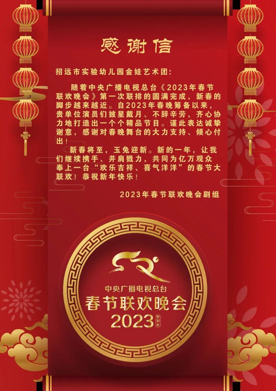 2023年春节联欢晚会剧组给招远市实验幼儿园金娃艺术团发来的感谢信。