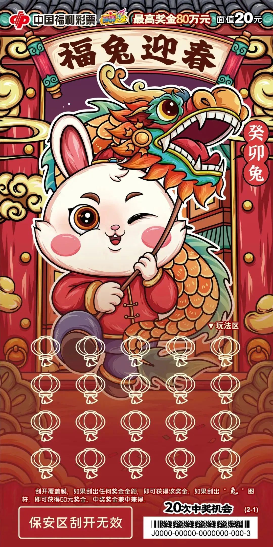 “福兔迎春”面值20元,全套2张,采用国潮手绘的明信片设计风格,将福兔舞龙舞狮的生动画面呈现于票面之上,与春节的喜庆祥和氛围相契合。刮开区的灯笼奖符,细腻而动感,与主题呼应。
