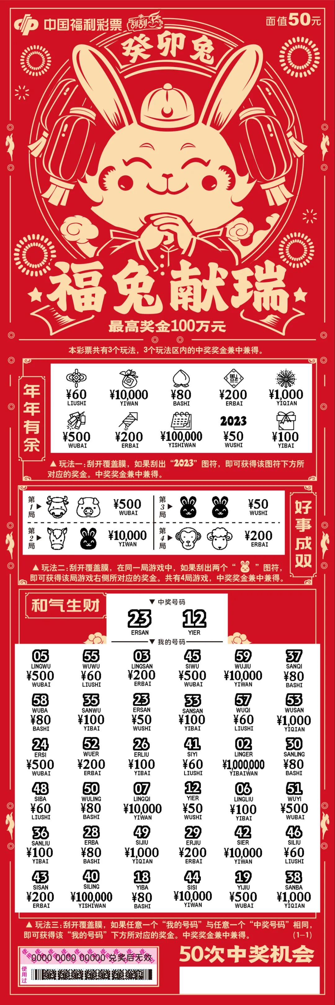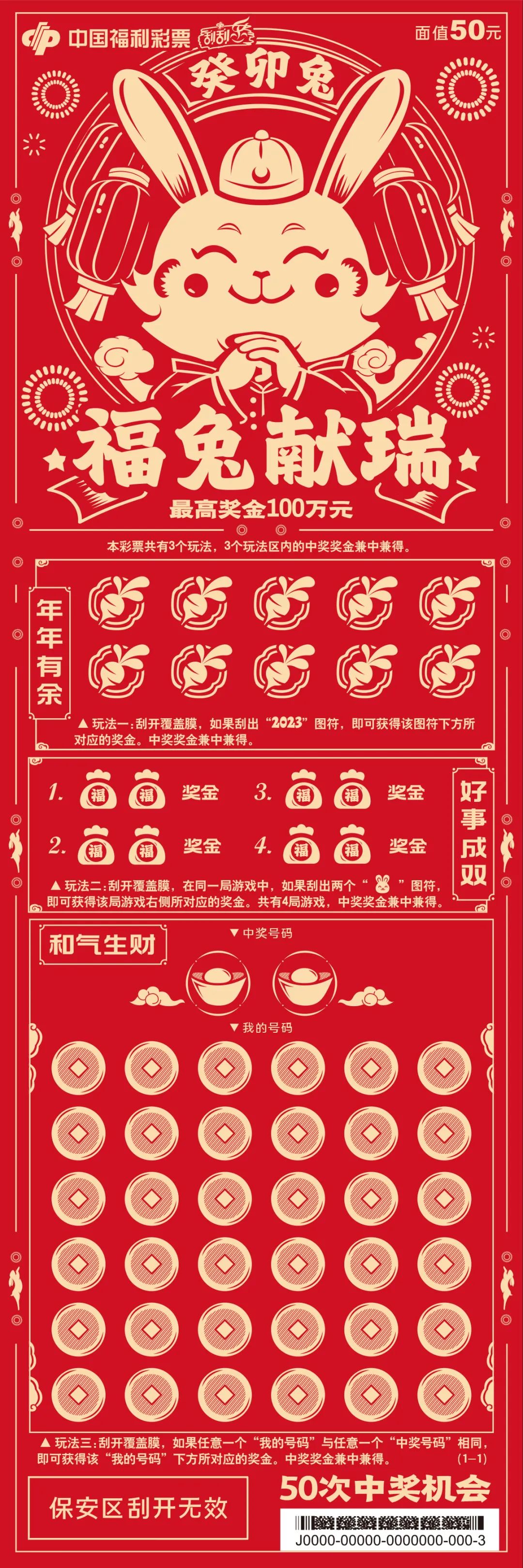 “福兔献瑞”面值50元,是一款高面值的生肖主题票,采用新版画设计思路,票面将金色兔作为主形象,红金两色搭配符合喜庆的春节气氛。“年年有余”“好事成双”“和气生财”三个玩法区,分别对应“即中”“两同图”“对数字”玩法,并将胡萝卜、钱袋、金币等元素作为相应玩法区奖符,增添节日的喜庆祥和气氛。