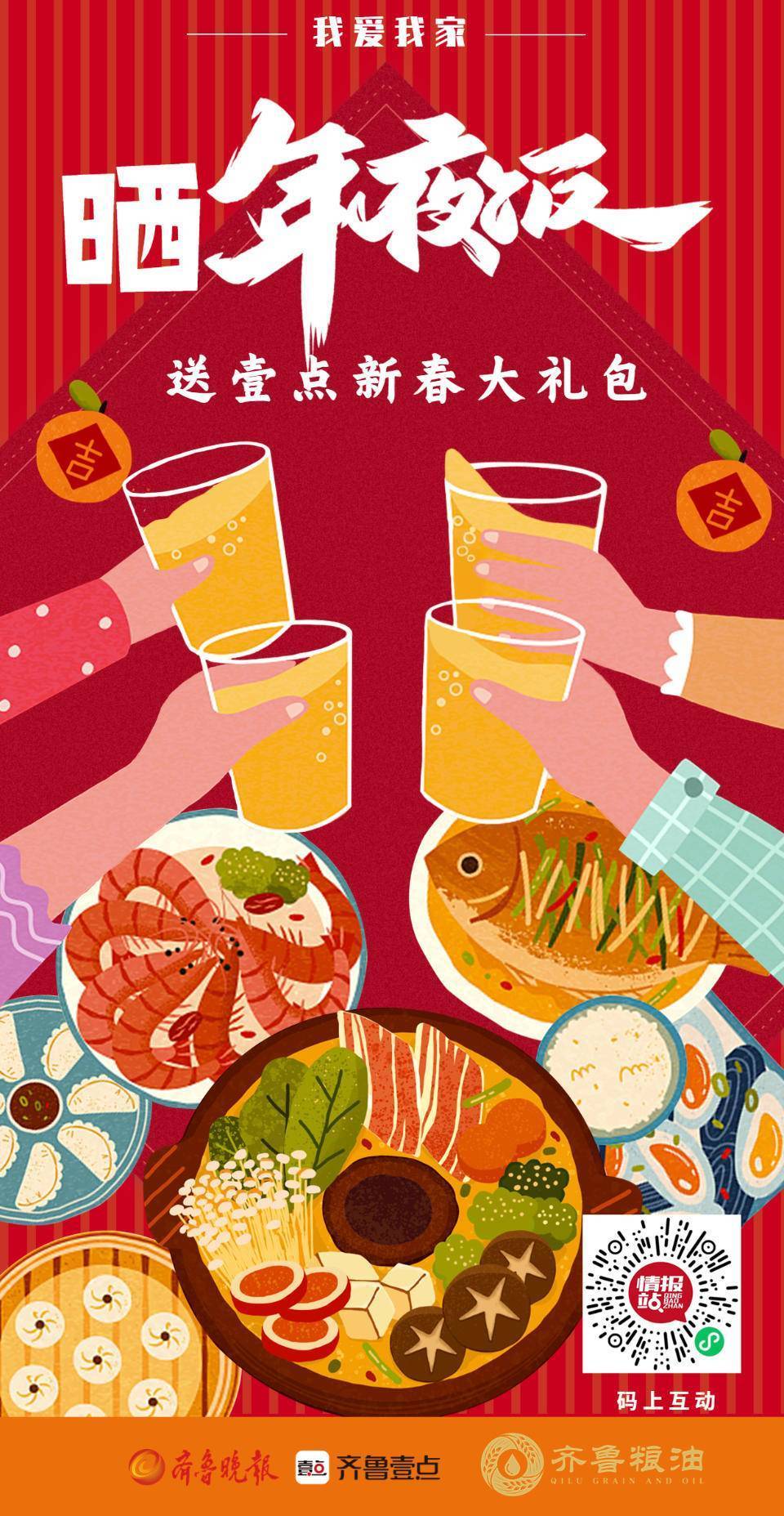 参与方式:通过齐鲁晚报官方客户端——齐鲁壹点,在情报站“话题”栏目中参与话题#晒晒我家年夜饭,齐鲁粮油礼包等你拿#+文字/图片或短视频上传即可。20个优质互动内容将获得由“齐鲁粮油”提供的价值百元的优质粮油礼包。