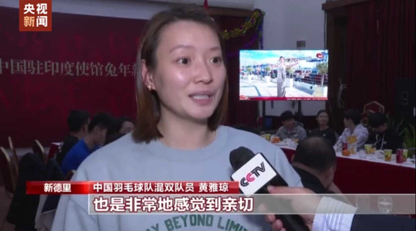 中国羽毛球队混双队员黄雅琼:非常的亲切,因为这也是我第一次在国外过春节,今天(21日)是除夕,能在这儿跟大家一起看春晚,也是非常地感觉到亲切。
