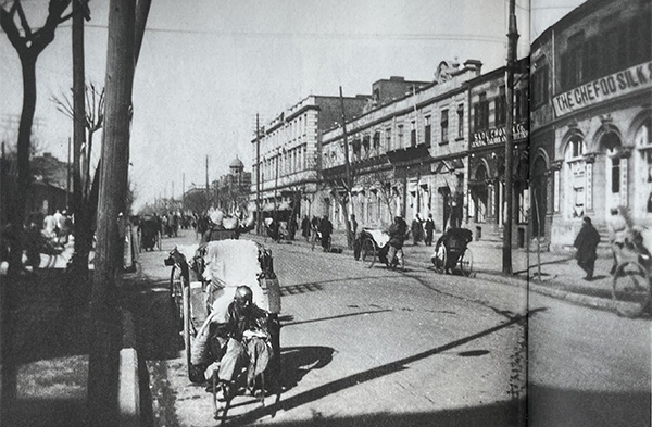 从这张济南街景的照片看,那时候已经初具都市模样,人力洋包车在等待拉客,逛街的游客虽不是摩肩接踵,也算熙熙攘攘,有些热闹的景象。让我感兴趣的是照片右边建筑物上的英文字母,真够洋气的。据大体认读,是一处卖烟台生丝的门市店。所谓生丝就是生蚕丝,烟台是中国主要生丝生产基地,出口量高居榜首。在济南商埠开店,也是看中商埠的国际地位,据此可以使这张照片无限接近第二个判断了。当然也有人提出,这里是不是烟台街景啊?那是不可能的,首先一点赵元任压根没去过烟台,其二烟台没有一条类似于这张照片的街道。