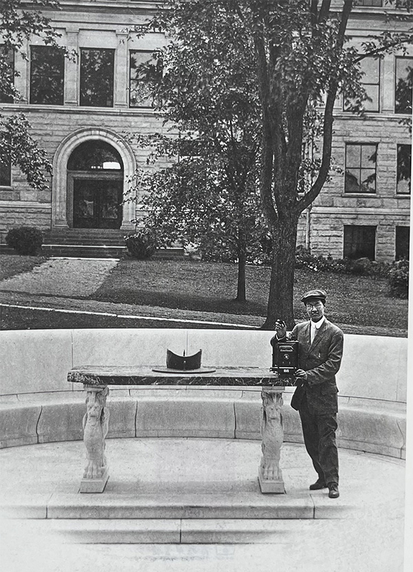 有人曾经这样说,在大师级学者中,赵元任是最会玩相机的专业级业余摄影师,在最会玩相机的少数人群中,他又是一位甚至是唯一一位被称为国学大师级的学者。这当然是玩笑。不可否认的是赵元任对于一切新事物的好奇心,引领着这位博学多才、充满探索精神的“大玩家”,一路向前,在包括数学、物理学、哲学、心理学、天文学、语言学、音乐、戏剧、摄影在内的多个高深领域,“玩”出卓越成就。赵元任的第一台照相机是1910年上大学不久用奖学金与同学合伙购买的,他为自己拍摄的最早的一张照片是1911年在美国康奈尔大学校园,最晚的照片是1981年哈佛大学校园,前后跨度达70年。岁月蹉跎,社会巨变,人事更替,有多少历史浓缩在赵元任的相机里。有一张赵元任扶着他心爱的照相机拍下的照片,我不太了解照相机的历史,看不出相机的品牌。想来,那会儿也就德国、美国数得着的几个大牌子。莱卡还是柯达,弄不清楚。值得庆幸的是,据说赵先生的大量照片将陆续整理在国内印行,一部旷达深邃的历史大书将徐徐展开,令人期待。我相信,我们肯定会见到更多有价值,与山东相关联的影像资料,一些与之相关的历史疑问和不确定,都将慢慢得到精准的答案。