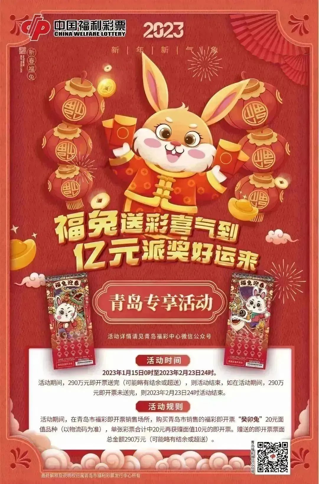 2023年1月15日0时至2023年2月23日24时,在青岛市福彩即开票销售场所,购买青岛市销售的福彩即开票“癸卯兔”20元面值品种(以物流码为准),单张彩票合计中20元再获赠面值10元的即开票。赠送的即开票票面总金额290万元(可能略有结余或超送)。活动期间,290万元即开票送完,则活动结束;若290万元即开票未送完,则2023年2月23日24时活动结束。