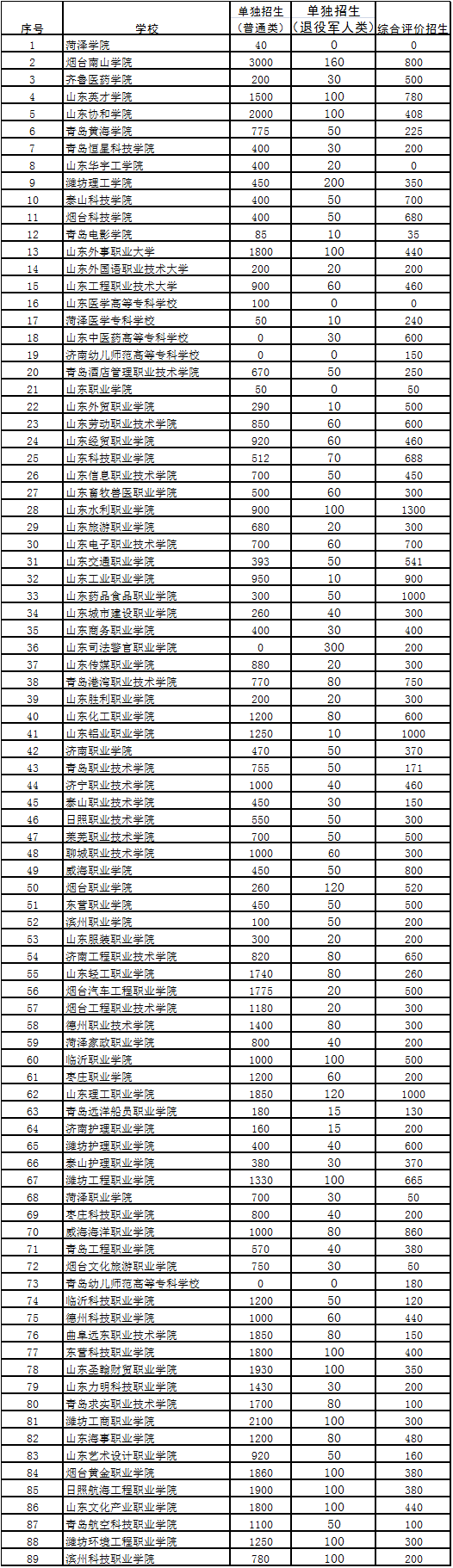 根据山东省教育厅发布的《关于做好2023年高职(专科)单独考试招生和综合评价招生工作的通知》,各学校的招生计划如下: