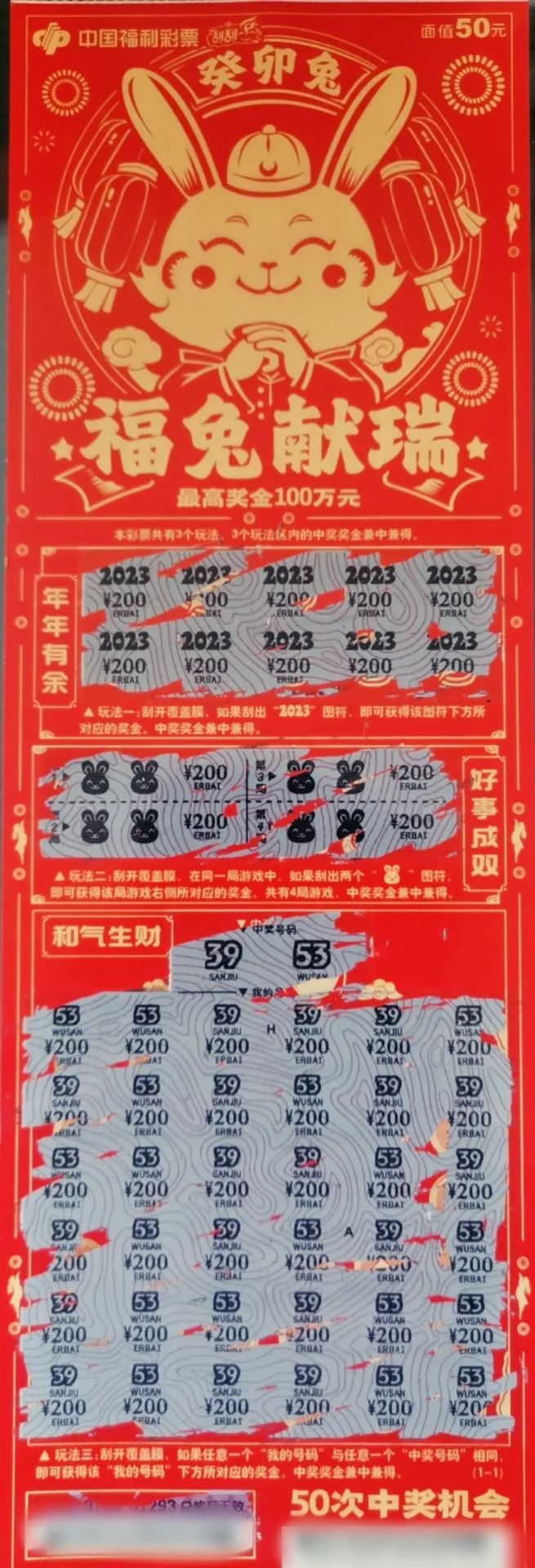 张先生特别喜欢刮刮乐,有机会就到福彩销售站刮上几张,尤其是有新票上市时,他都会去“尝尝鲜”。这次" 癸卯兔 "系列生肖票上市,张先生也是充满了期待。中奖那天,他和朋友一起来到福彩37021236销售站,一眼就被充满了春节氛围的面值50元生肖票“福兔献瑞”吸引了,他当即拿了一本刮了起来,刮出数个小奖后,突然有一张,玩法一中的每个图符“2023”下面都对应着“¥200”的中奖图符!“哇,哇!”张先生一边刮一边喊,玩法二和玩法三也都中出奖金了!“哇,中了1万元!”刮完后张先生激动得跳了起来!兴奋之余,他再次认真查看了一遍玩法介绍后,又喊来工作人员帮忙确认。