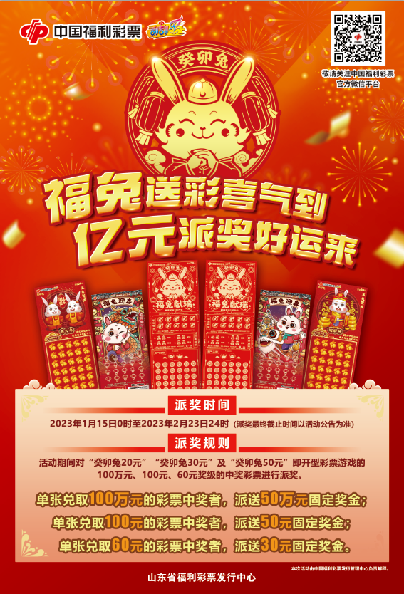 " 癸卯兔 " 系列即开票游戏,派奖活动火热进行中,福兔迎春至,欢乐好运来。兔年生肖票 " 癸卯兔 " 系列即开票游戏派奖活动火爆进行中! " 癸卯兔20元 "" 癸卯兔30元 "" 癸卯兔50元 "均可参与,派奖奖金预计2亿元。