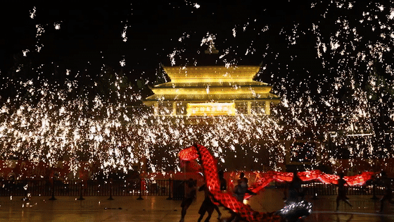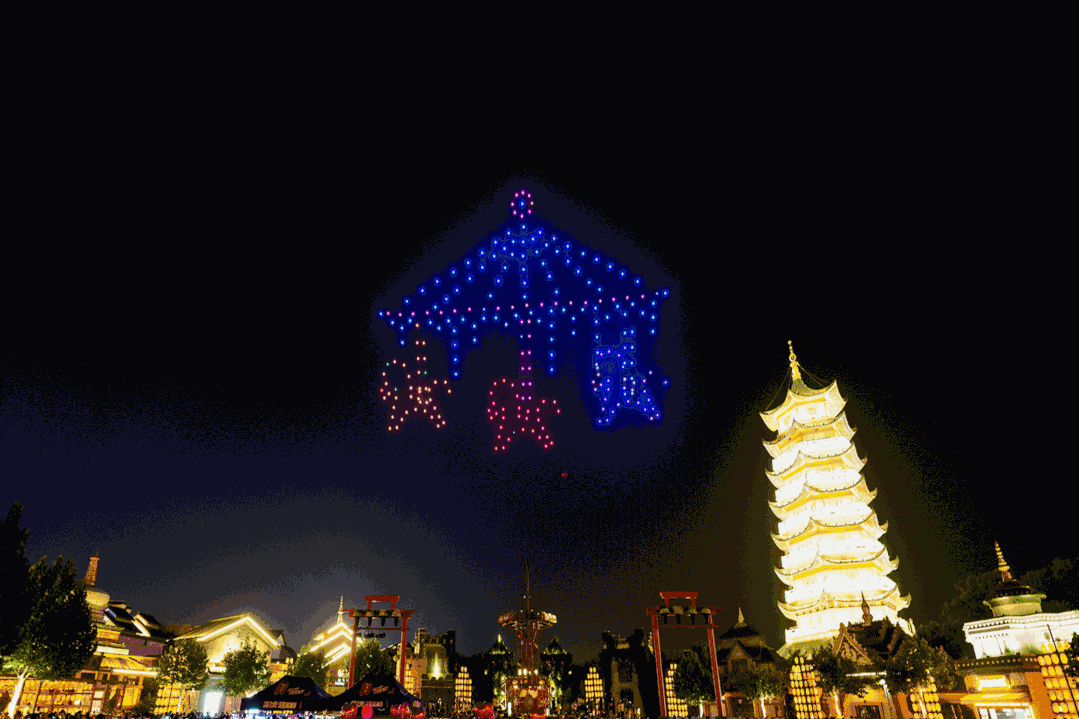 还有百余架无人机在空中升起,夜空里的浪漫童话不断上演。