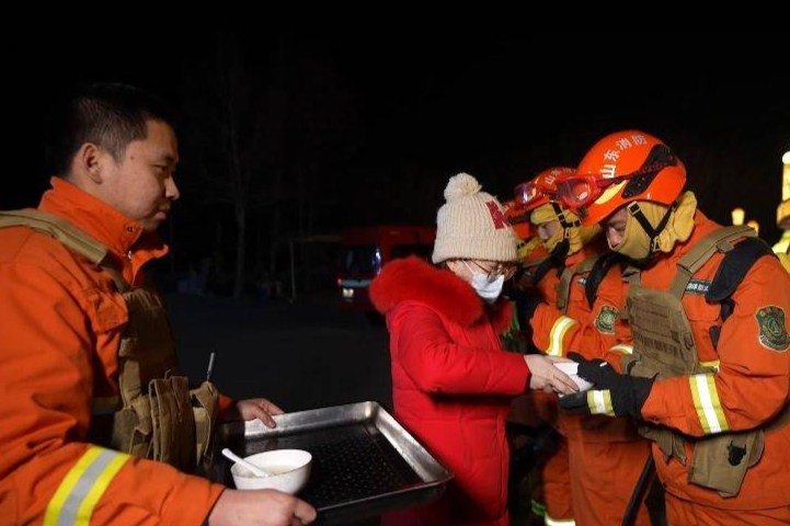 此外,为了让坚守在一线的执勤人员过上一个温暖的元宵节,淄博市消防救援支队安排后勤人员,把煮好的汤圆送到各防控点消防员的手里,让他们利用休息时间与灯会的游客共庆元宵佳节。