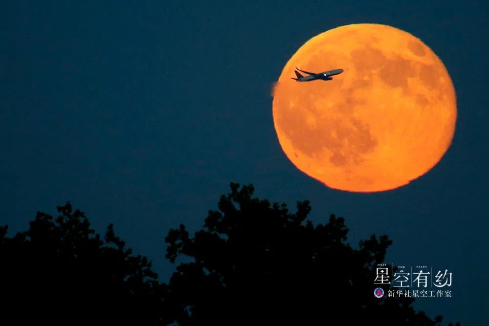 这是2015年7月31日在美国泽西城拍摄的一架飞机从“蓝月亮”前飞过。新华社