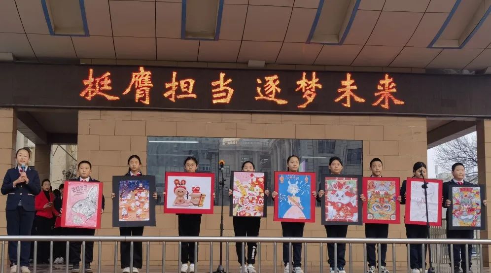 六年级的同学展示荣登山东美育、历下区教体局公众号的美术作品《新春迎玉兔·云端炫艺彩》,赢得全校师生的热烈掌声。