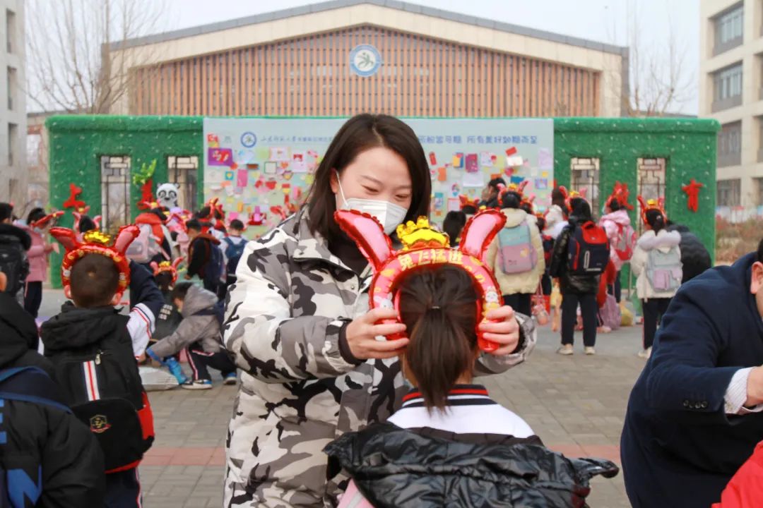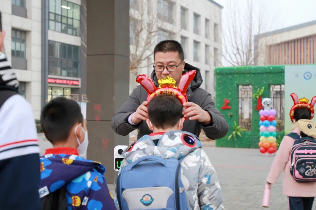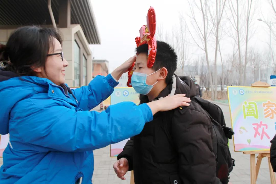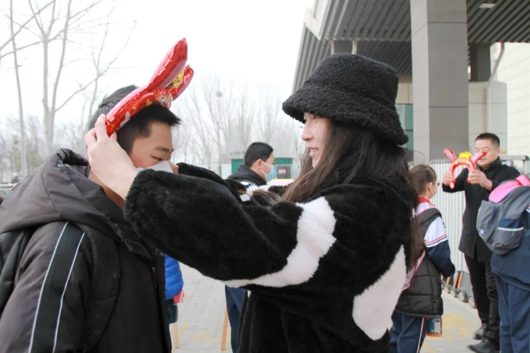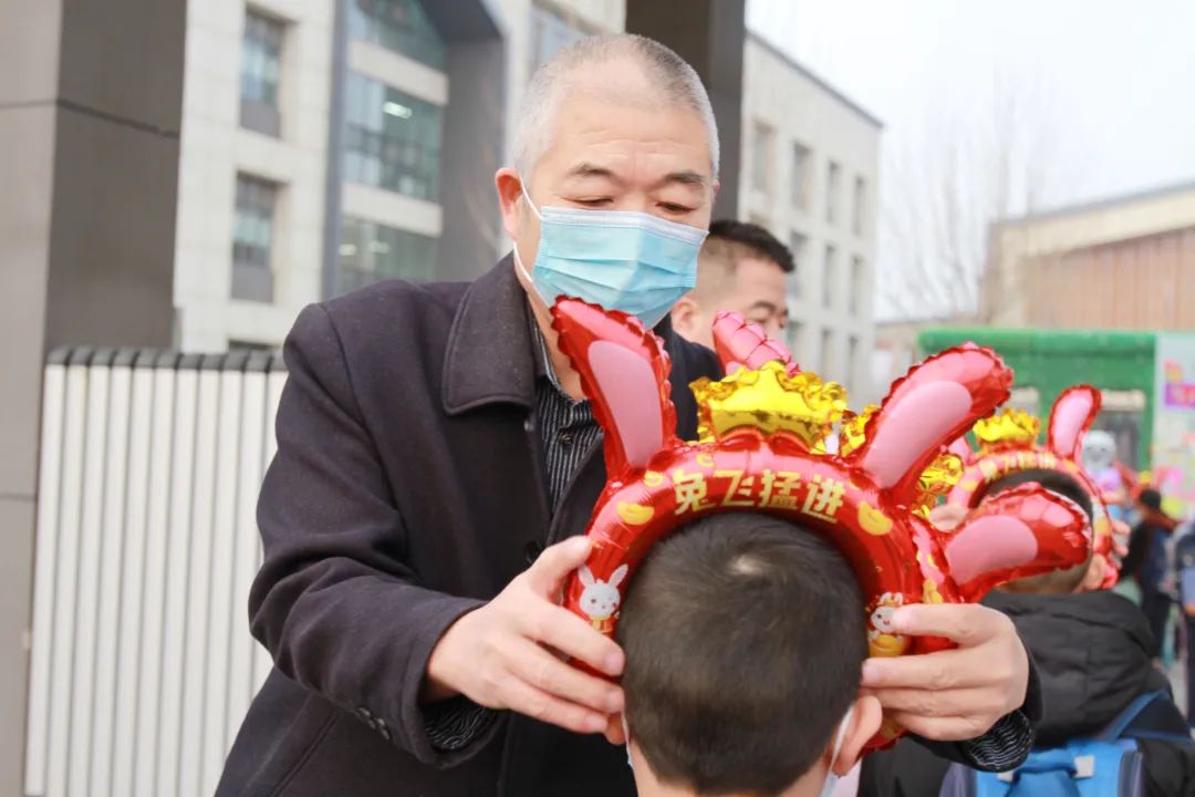 2月6日上午,学校安排了各种惊喜迎接同学们归来。“祝福走廊”的标语是老师对学生的希望与期待。通过“祝福走廊”来到校门口,学校领导和老师满心欢喜的为每位学生戴上“兔”飞猛进兔耳朵头饰,孩子们笑靥如花,感谢老师的精心准备与辛勤付出。