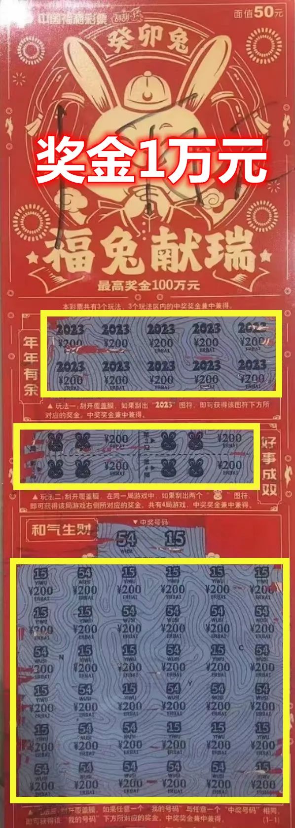 上面这张1万元的中奖票,是烟台市牟平区37061207号销售站彩友凭借面值50元“癸卯兔”生肖票中得。