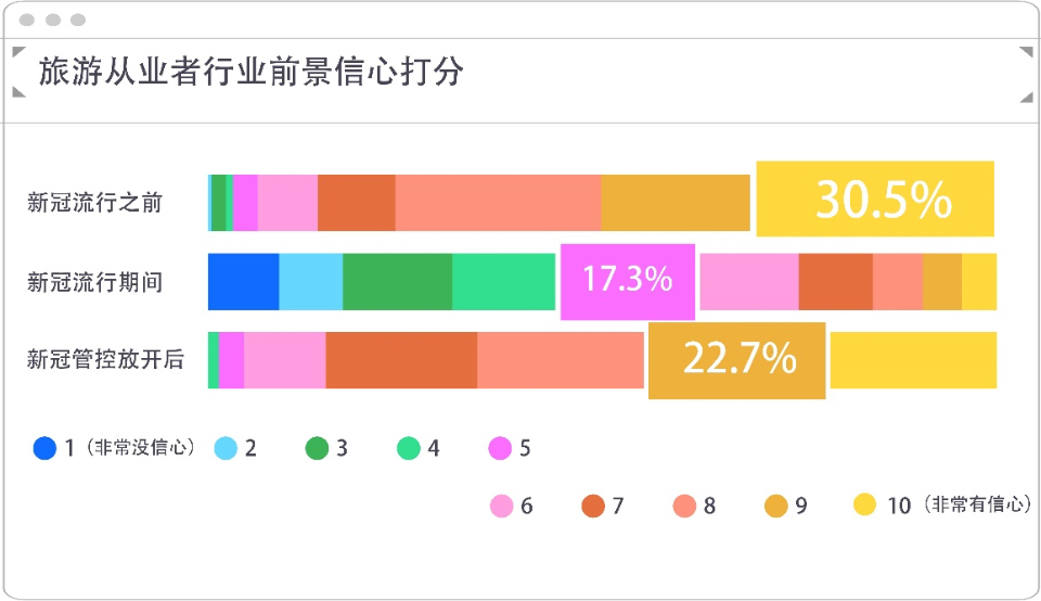 2023开年以来,旅游业呈现“高开稳走”的态势,但经历三年亏损的市场主体的恢复也并非一朝一夕。对于开放后的行业前景预期,调研显示,在以1-10分的旅游业信心打分中,当下,合计44.1%的受访从业者对放开后的行业信心打出了9-10分,虽仍低于疫情前的49.6%,但远高于该分数段在疫情期间的信心打分9.5%的占比。