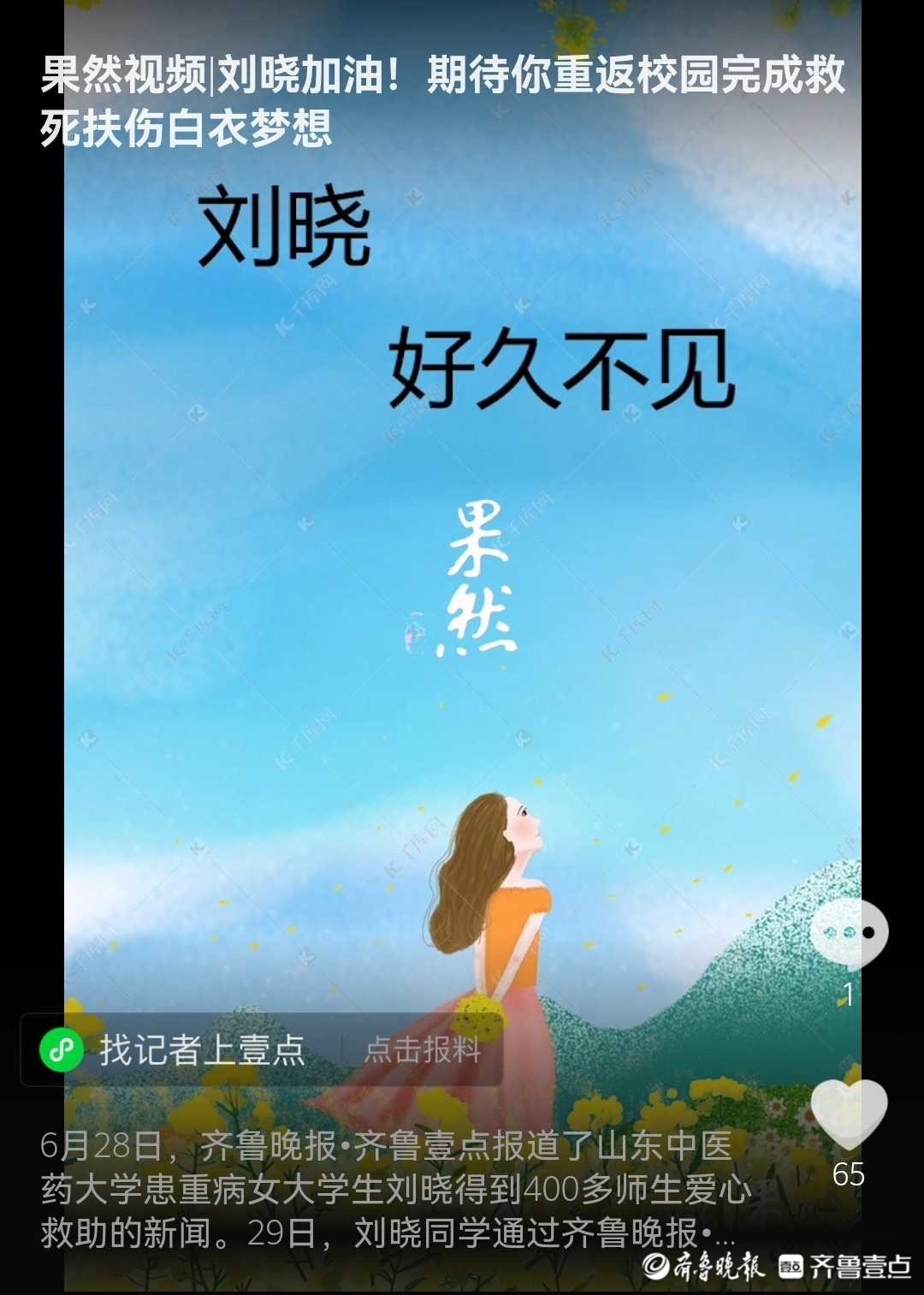 2020年6月28日,齐鲁晚报•齐鲁壹点报道了全校400多名师生救助刘晓的新闻之后,广大读者也纷纷献爱心,积极救助刘晓。