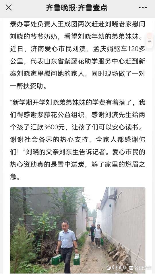 看到齐鲁晚报•齐鲁壹点相关新闻报道,爱心志愿者纷纷献爱心支持刘晓和她的家人。有的志愿者亲自去刘晓家里探望老人;有的志愿者为刘晓弟弟、妹妹辅导功课;有的志愿者为刘晓的弟弟妹妹提供长期帮扶,定期捐赠助学金,让他们在校园里安心读书......
