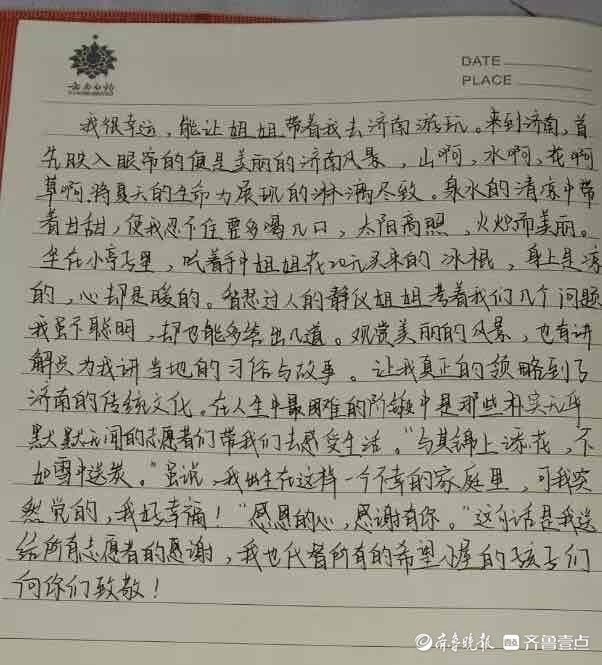 “济南美丽的山泉湖河,悠久的历史文化都让我印象深刻。还有那些关心我的叔叔阿姨,让我觉得好幸福!”谈起初次来到济南的场景,然然的话语间难掩兴奋与激动,向记者分享着她看到的风景以及感受到的温暖。