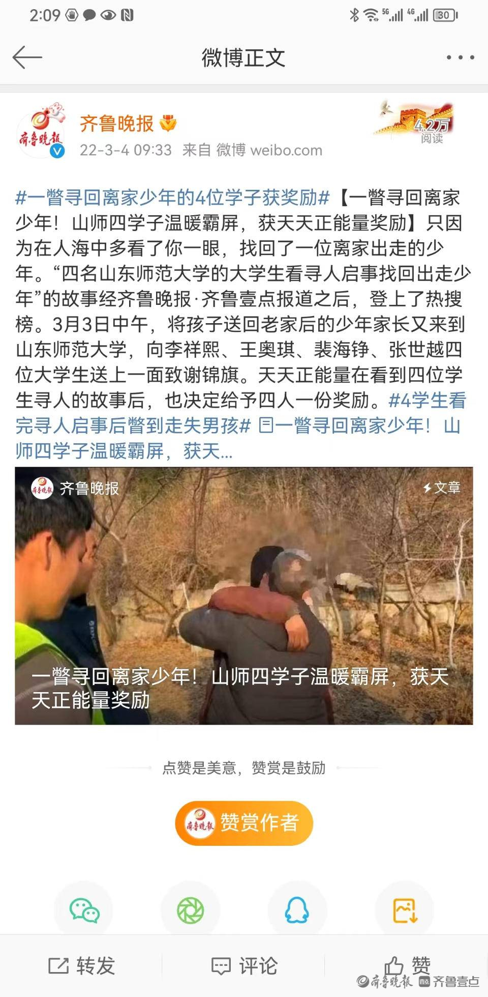 一年前,来自山东师范大学信息科学与工程学院的王奥琪、裴海铮、李祥熙、张世越四位同学在出租车上的有心“一瞥”,帮助离家出走多日的男孩回到家人怀抱。事后,阿里巴巴天天正能量给予四人5000元的正能量奖励。而在拿到奖励没多久,四人就把这笔奖励全都捐了出去。