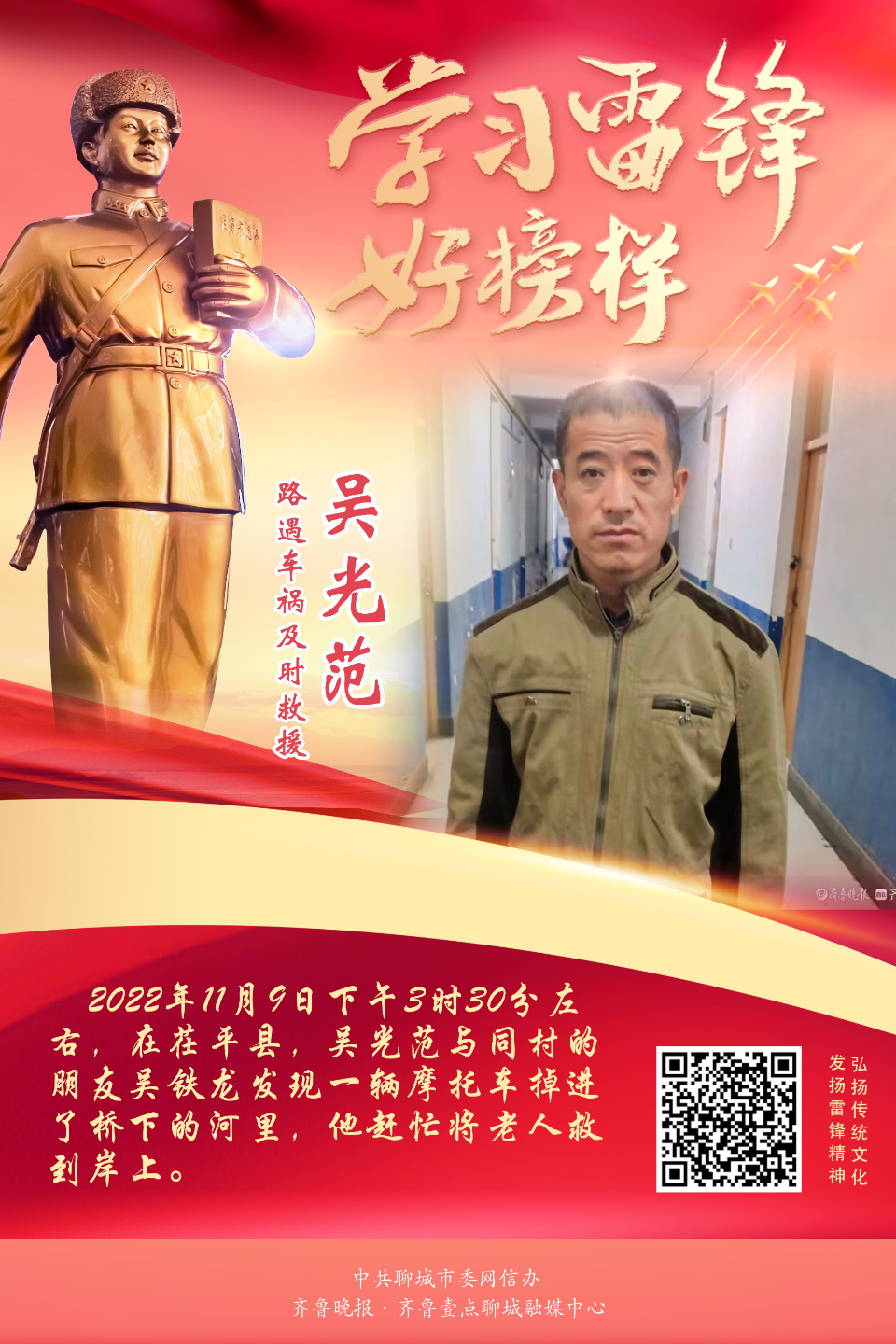 壹海报|致敬“聊城雷锋”!看见闪闪发光的力量 大众报业·齐鲁壹点 2023-03-04 3432 记者 闫修晨 实习生 张保岳 今年3月5日,是第60个学雷锋纪念日。 60年的传承,60年的跨越,雷锋精神所蕴含的信念的能量、大爱的胸怀、忘我的精神、进取的锐气,早已融入我们的日常生活。 一个又一个“雷锋”涌现并活跃在我们身边。春暖花开之际,让我们再次重温他们的善行义举,见证这份闪闪发光的力量。 责任编辑:李璇