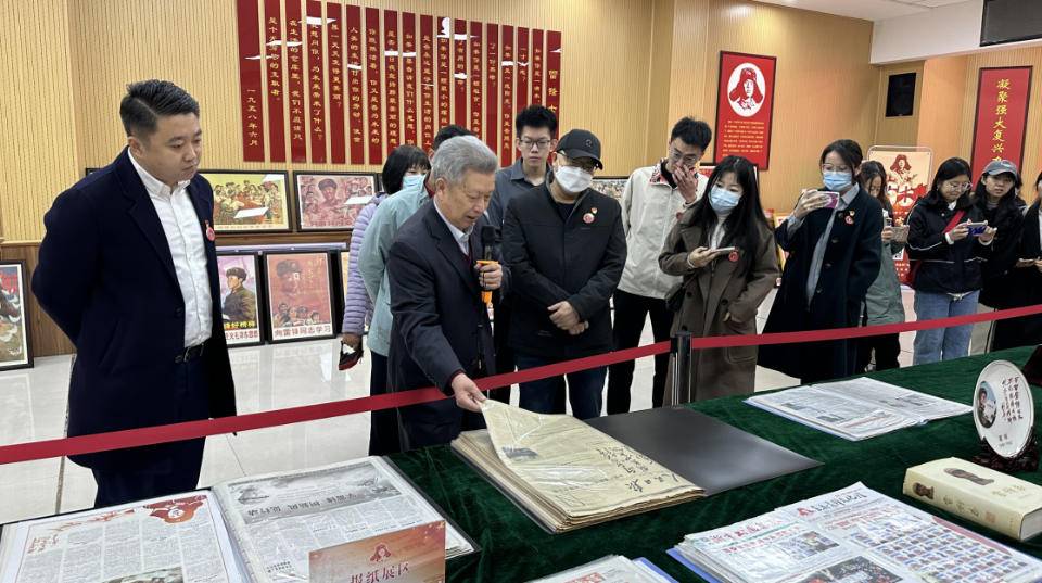 与雷锋展馆内的固定展陈所不同的是,这场名为“遇见雷锋——张茂路雷锋史料藏品展”中展出的不少藏品,都是张茂路近年来的整理后才首次亮相的。这其中,一张1963年3月出版发行的《人民日报》头版上,赫然印有毛泽东主席题写的“向雷锋同志学习”。在介绍完这张珍贵的报纸后,学生们纷纷被这份历史的印记所深深震撼,纷纷举起手机拍下来以做保存。