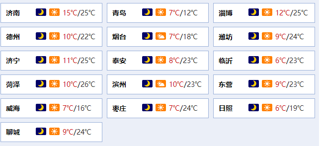 最低气温:临沂、日照、鲁中山区和半岛地区6℃左右,济南和淄博13℃左右,其他地区10℃左右。