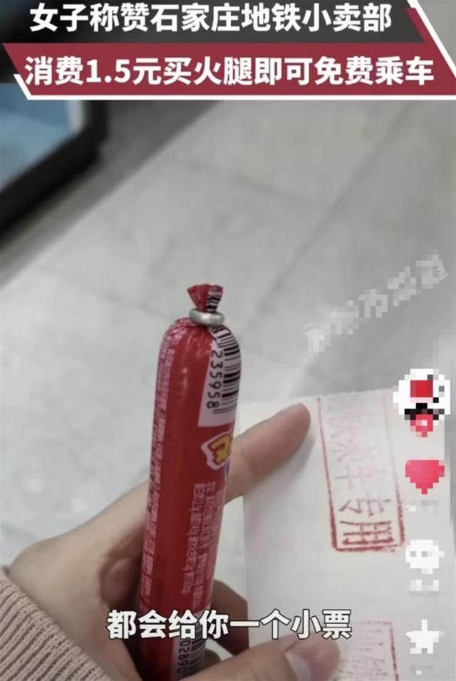 有网友花费1.5元,在石家庄地铁站内便利店买了一根火腿肠,就享受到免费乘地铁的待遇,这令她十分新奇。3月5日,石家庄地铁回应称,市民在指定店铺购物,金额不限,就可享受免费乘地铁,此举是鼓励大家绿色出行。