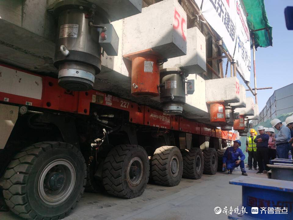 托着三元宫往前“走”的“功臣”,正是底部的两列大型液压平板拖车。一旦路面不平甚至出现局部沉降,拖车能随时调整,保持拖车平板始终处在一个水平面上,从而保证建筑物的安全。