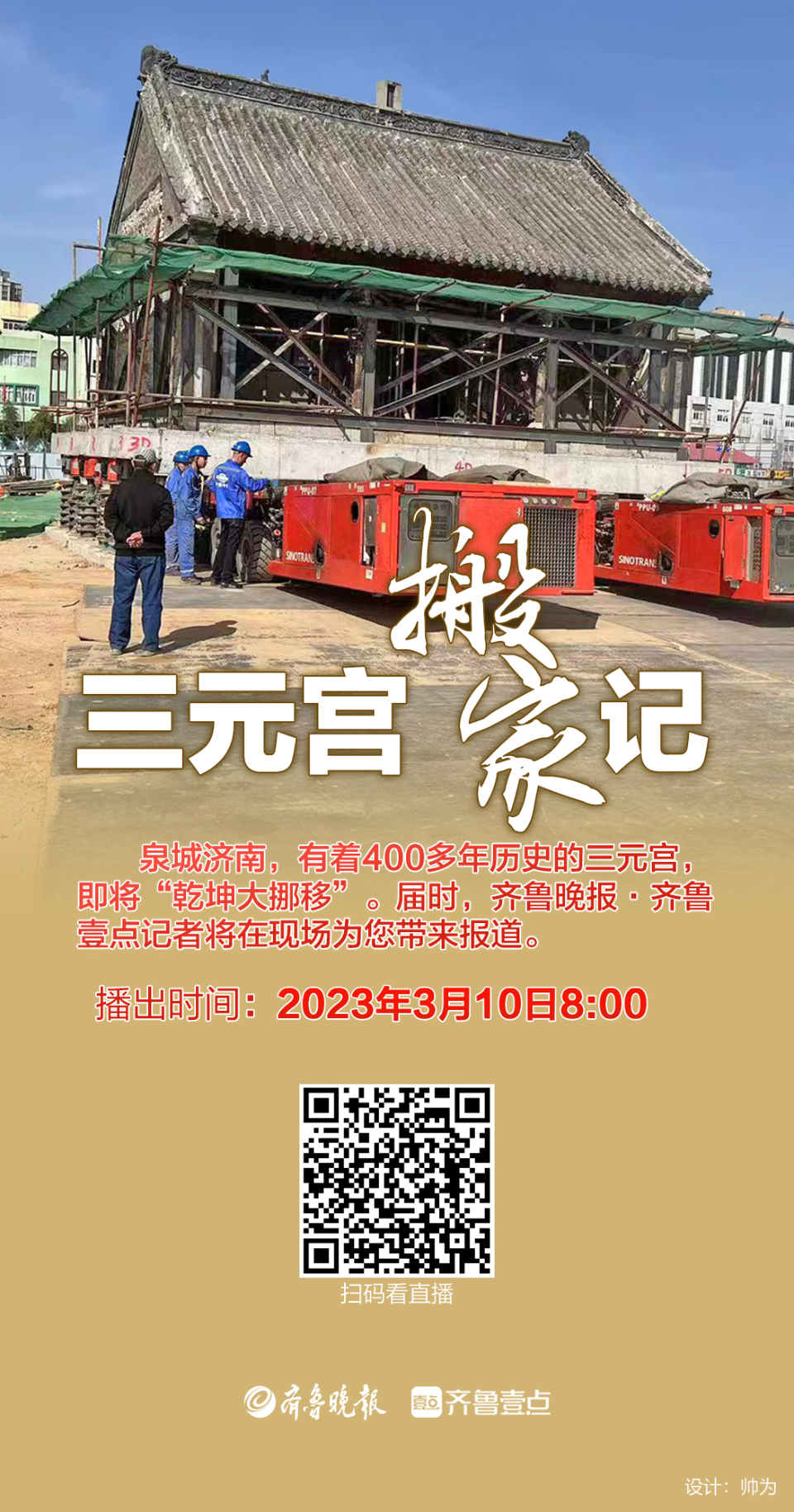 作为一座有着400多年历史的老建筑,位于济南市历下区科技城片区的三元宫见证了济南的沧桑与变迁,感受着城市发展的律动与脉搏。2023年3月10日,必是载入济南城市发展史册的一天。98分钟、255米、280吨,这座历史建筑“走”到了工业南路与化纤厂路交叉口附近,面向了街道的车水马龙,继续见证着泉城发展的日新月异。