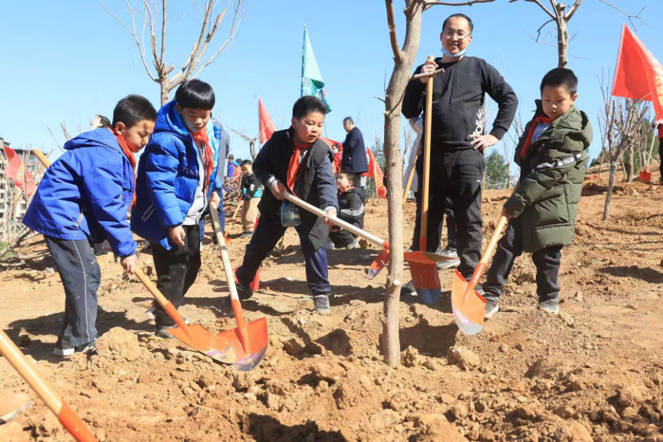 植树现场,成员们三五人一组,挥锹铲土、扶苗填坑、提桶浇水,整个场面繁忙而有序。手腕粗的大树苗在几个人的协作下,被栽种进到坑洞中,培土、拍土、踩实、浇水,大家个个干劲十足,配合默契,把每道工序都做得认真细致。“我今天种了两棵比我还高的侧柏。”“我种了三棵。”参与植树的小学生们扬起累得红彤彤的笑脸,纷纷表示,非常开心能参加这次义务植树,以后自己每年都要种一棵树。