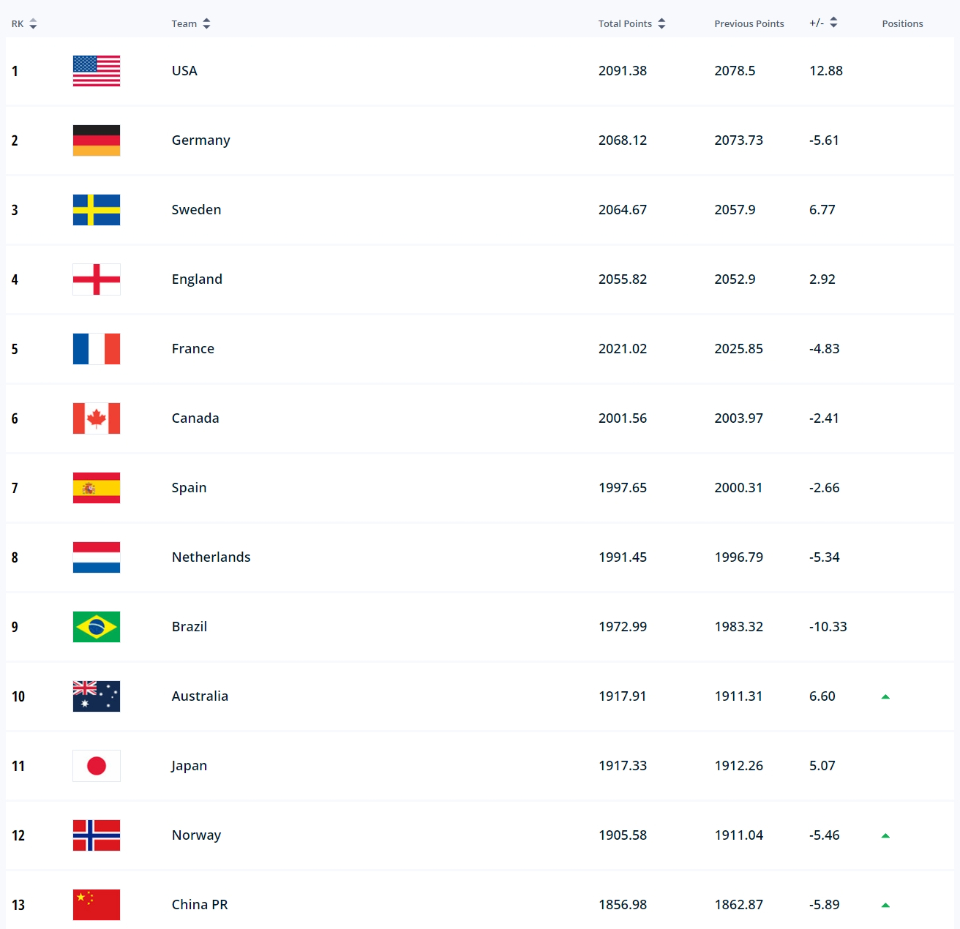 FIFA女足排名:中国女足上升一位,排名世界第13、亚洲第3