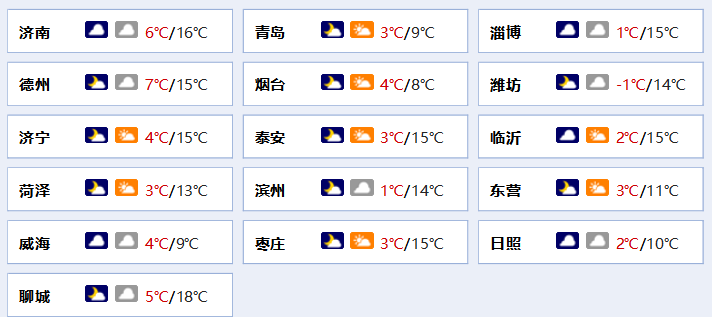 最低气温:潍坊、日照和半岛内陆地区-1℃左右,有冰冻;德州、聊城、济南和菏泽5℃左右,有轻霜冻;其他地区2℃左右,有霜冻。 最高气温:沿海地区10℃左右,其他地区15℃左右。