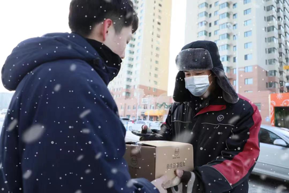 春节期间,黑龙江顺丰快递员为客户送货