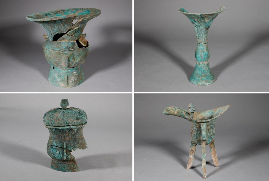 This combo photo shows bronze wares unearthed from the royal tomb area and surrounding relics in the Yin Ruins dating back to the Shang Dynasty (1600-1046 B.C.), in the northwest suburbs of Anyang, central China's Henan Province. (Xinhua)