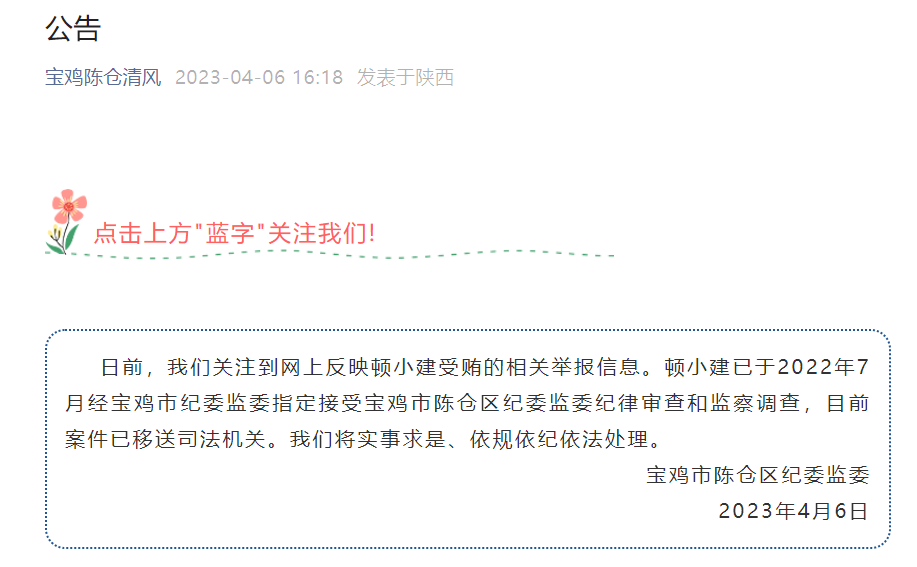 4月6日,宝鸡市陈仓区纪委监委通报:日前,我们关注到网上反映顿小建受贿的相关举报信息。顿小建已于2022年7月经宝鸡市纪委监委指定接受宝鸡市陈仓区纪委监委纪律审查和监察调查,目前案件已移送司法机关。我们将实事求是、依规依纪依法处理。