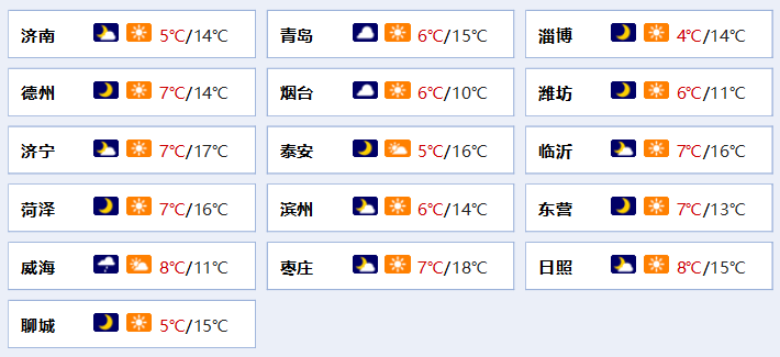 最低气温:鲁西北、鲁中山区和半岛内陆地区2℃左右,有霜冻;其他地区5℃左右,有轻霜冻。 最高气温:潍坊、烟台和威海10℃左右,鲁南地区17℃左右,其他地区14℃左右。