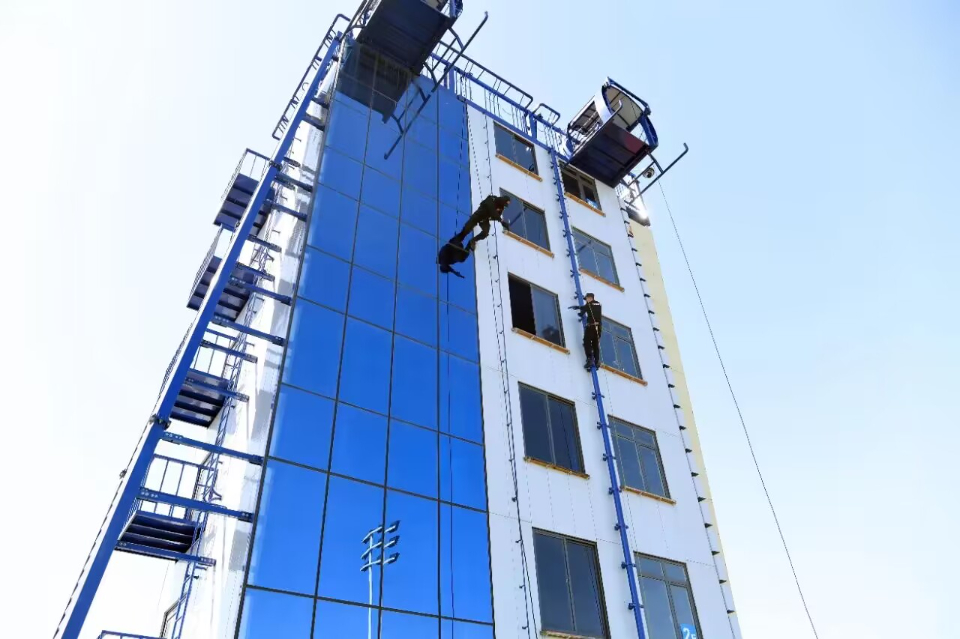 在模拟处置暴恐分子警情时,一名攀登队员正通过大楼雨露管向上攀登,索降队员从楼顶以倒置姿势迅速降至4楼,与攀登队员汇合。同时,无人机升空至4楼后迅速进入进行喊话!
