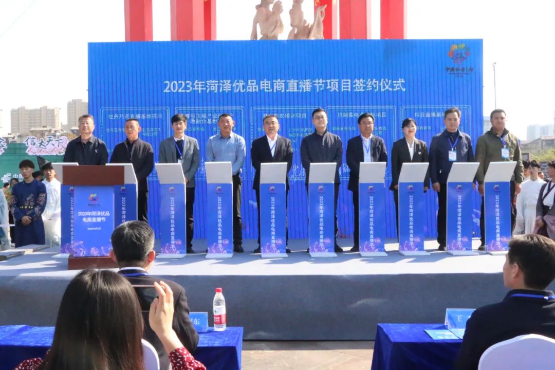 菏泽市电商合作项目百花齐放,启动仪式上,辛火助农培训项目、牡丹芍药直播基地项目、曹县汉服产业创新产教融合基地项目、预制菜电商合作项目、抖音直播基地等一批重点电商项目进行了集体签约。