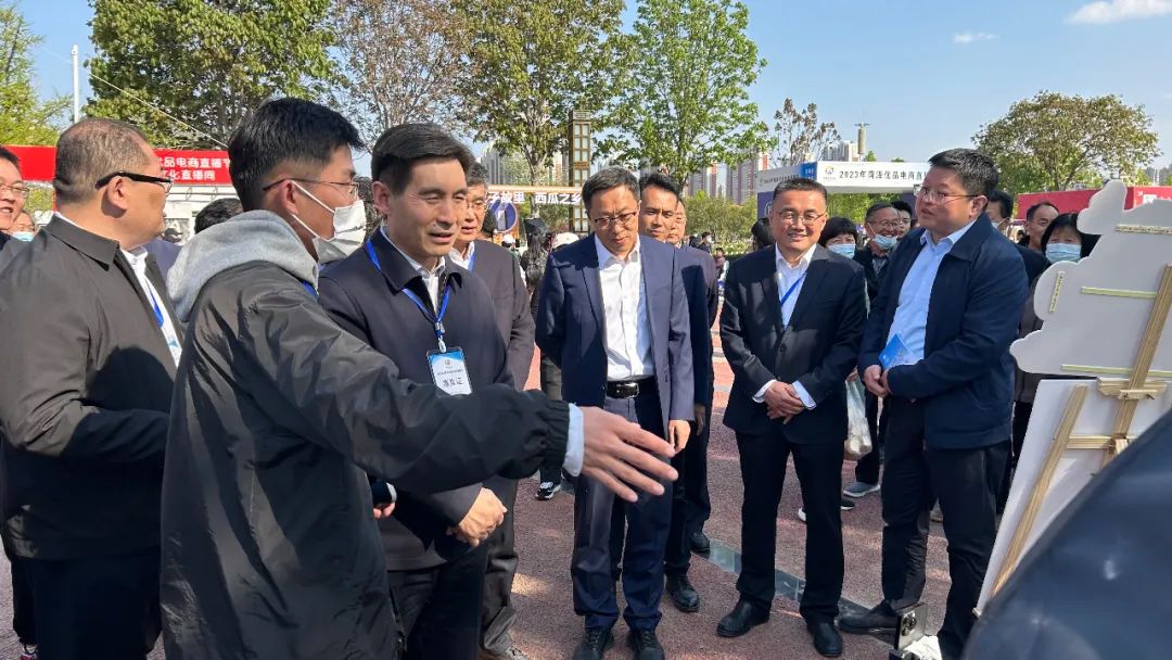 市人大常委会主任王磊,市政协主席王卫东,阿里巴巴集团战略发展部总经理林青叶,市政府副市长张鹏,市政府办公室三级调研员马振,市商务局党组书记、局长尹慧萍,菏泽籍电商主播京城小二孙海丽上台,共同启动“2023年菏泽优品电商直播节”。