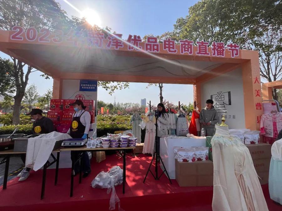 为把菏泽更多的特色产品推向全国,进一步推动直播经济在菏泽的发展,4月7日下午,2023年菏泽优品电商直播节在曹州牡丹园正式启动。本次活动由山东省商务厅、菏泽市人民政府指导,菏泽市商务局、中共菏泽市直播电商行业委员会主办,与阿里、抖音等国内知名电商平台深入合作,现场共搭建16个直播间,同步开展线下展销、线上推广活动,各位主播带观众云赏曹州牡丹园,赏美景、品美食、购优品。