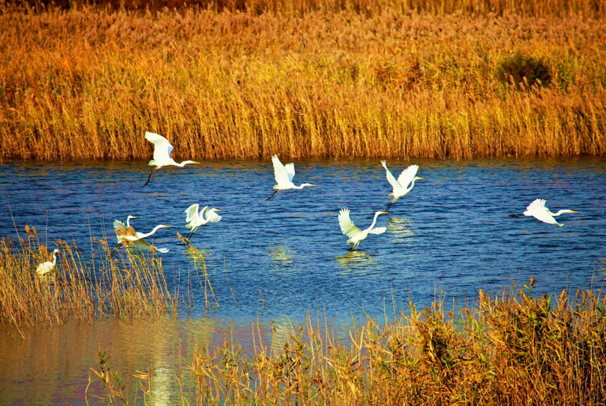 黄河三角洲内的白鹭在水边悠闲戏水 (高冬柏摄)