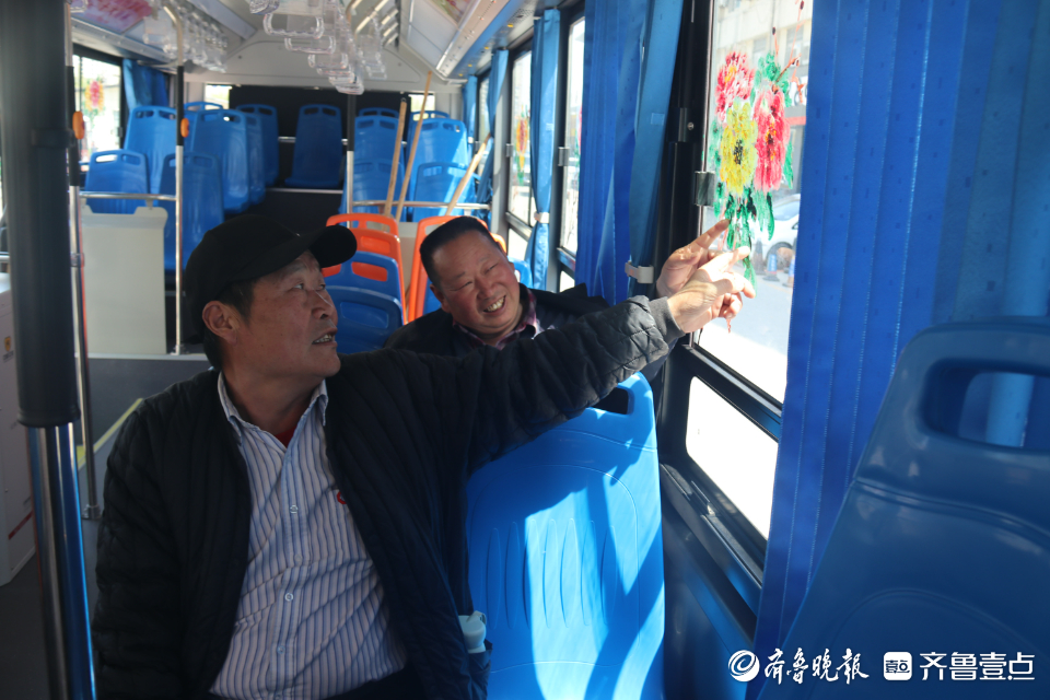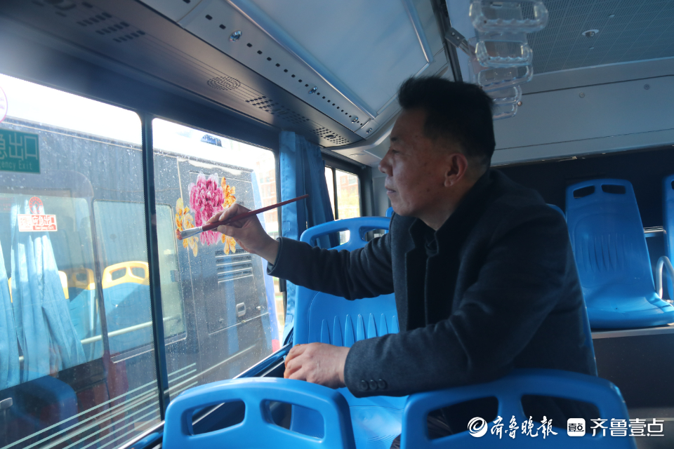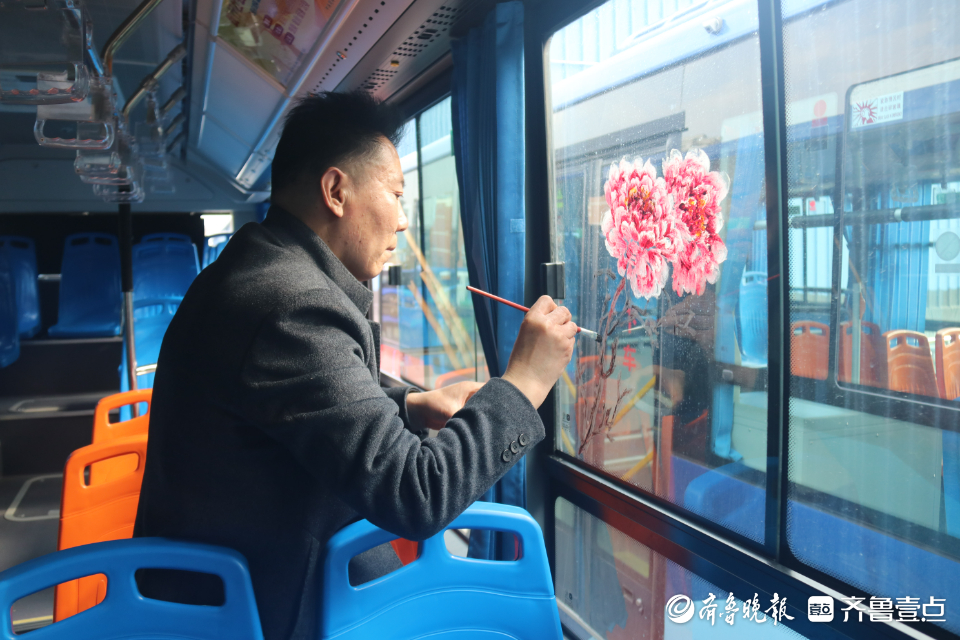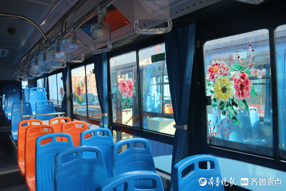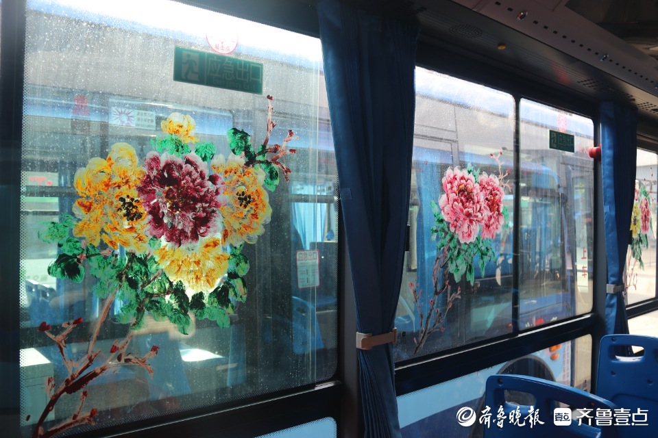 走进车厢朵朵怒放的牡丹立刻映入眼帘,车窗上红色、橙色、粉色的牡丹竞相开放,这些漂亮的手绘牡丹花都是出自城际公交职工李政宇之手。