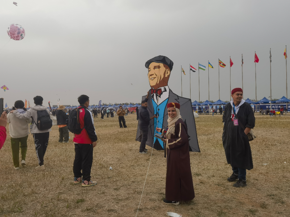在本次潍坊风筝会中,有许许多多来自世界各地的国际友人,他们都因为风筝结缘并在此产生了更加深刻的友谊。来自土耳其和突尼斯的参赛队员一同在一只土耳其风筝面前合影,他们绽放出了最真诚又纯洁的笑容,再一次向全世界展示了来自潍坊的包容与开放,团结与友好。