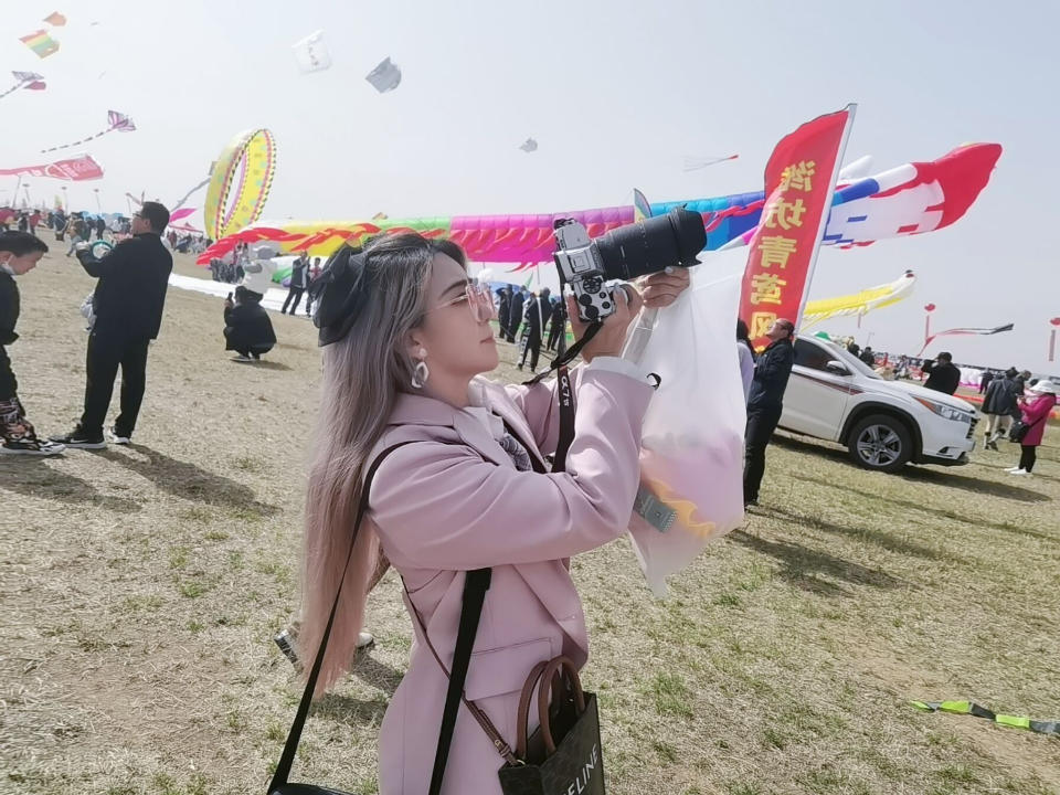 网络达人“背包客紫漫”在拍摄风筝
