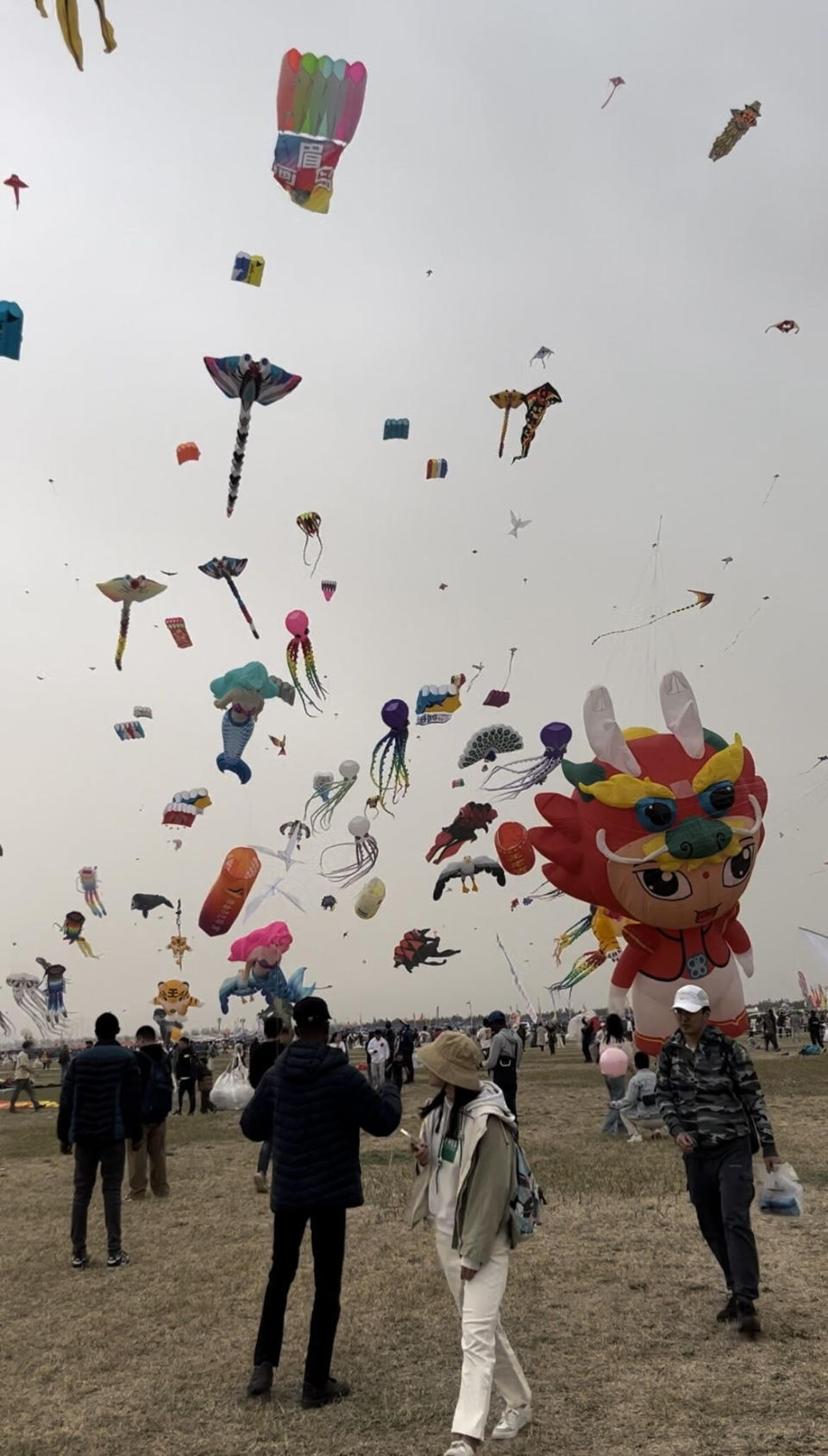 临近上午10点,向放飞场的上空望去,已经是密密麻麻的一片风筝。175米长的龙头蜈蚣风筝需要好几个人一起拉绳才能控制,十一架风筝在空中形成编队上演“空中芭蕾”,直径24米大风筝放飞需要7人同时发力,风筝会现场最长巨龙风筝长达280米,此外,还有B站小电视风筝、骷髅风筝、硬核标语风筝。各色风筝同台竞技,让来到现场的游客赞不绝口。