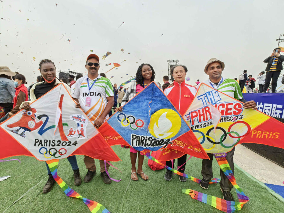 在放飞场,风筝爱好者张大功制作的祝福巴黎2024奥运会风筝受到了来自外国友人和现场放飞者的点赞。“我今天带来了4只我亲手绘制的祝福2024年巴黎奥运会的风筝,今天是第40届潍坊国际风筝会开幕,我在这里征集到了许多外国友人的祝福和签名,我要把潍坊人民的微笑和祝福通过风筝,带到巴黎,传遍世界。”张大功说。在放飞场,张大功与来自学校的师生和外国友人一起放飞他制作的奥运风筝,共同为巴黎奥运会送上祝福。