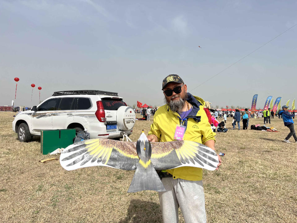 来自西安的风筝参赛者邢政展示自己的手作风筝